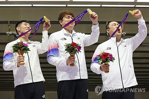 정유진(청주시청), 하광철(부산시청), 곽용빈(충남체육회)으로 구성된 남자 사격 대표팀은 26일 중국 항저우 푸양 인후 스포츠센터에서 열린 남자 10m 러닝타깃 혼합 단체전에서 1천116점을 기록, 금메달을 획득했다.