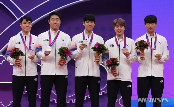 [항저우=뉴시스] 고승민 기자 = 26일 중국 궁수 커낼 스포츠파크에서 열린 2022 항저우 아시안게임 남자 탁구 단체전에서 은메달을 차지한 한국 선수들이 기념촬영하고 있다. 왼쪽부터 장우진, 임종훈, 박강현, 안재현, 오준성. 2023.09.26. kkssmm99@newsis.com