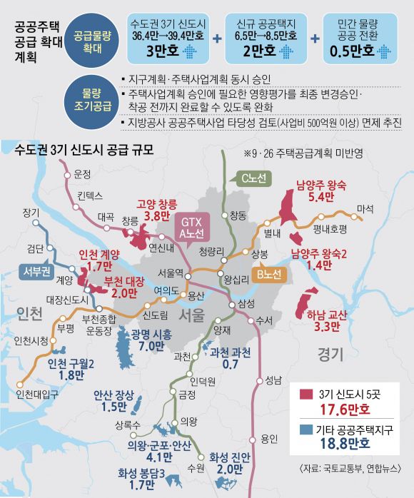 공공 부문이 먼저 공급의 마중물 역할을 하겠다는 게 정부의 의지다. 전략은 이렇다. 수도권 신도시 3만호와 신규택지 8만 5000호, 민간 물량의 공공 전환 5000호 등 12만호 수준의 물량을 추가 확보한다. 3기 신도시엔 17만 6000호 규모 공급이 계획돼 있는데 토지 이용 효율성을 높여 3만호를 더 공급한다는 계산이다. 이렇게 되면 조성 원가가 줄어 전용 85㎡ 기준 약 2500만원의 분양가 인하 효과도 있다. 추가되는 지역이 어디인지는 아직 공개되지 않았는데, 후보 지자체와 협의를 통해 물량은 더 늘어날 수 있다.