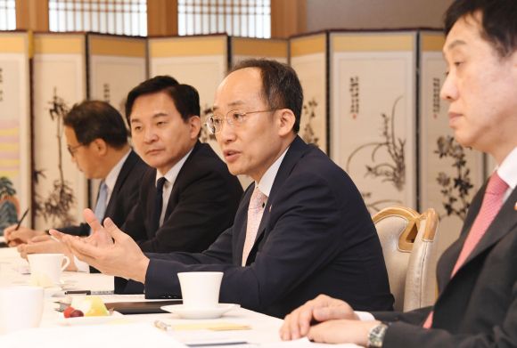 추경호(왼쪽 세 번째) 부총리 겸 기획재정부 장관이 26일 정부서울청사에서 부동산관계장관회의를 주재하고 있다. 추 부총리는 “국민들께서 양질의 주택이 필요한 곳에 충분히 공급된다는 것을 체감하실 수 있도록 대책을 철저히 이행하겠다”고 말했다. 추 부총리 오른쪽 옆은 원희룡 국토교통부 장관.  뉴시스