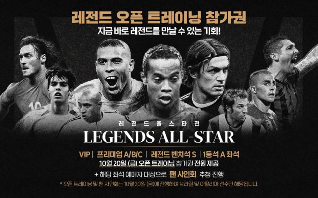대한민국브라질이탈리아 3개국 레전드 들이 참가하는 올스타전이 오는 10월 21일 고양종합운동장에서 열린다. 킥오프 시간은 오후 5시 30분이며 제 1경기 대한민국 vs 이탈리아, 제 2경기 브라질 vs 대한민국, 제 3경기 이탈리아 vs 브라질 순이다. 각 경기는 전후반 20분 씩 총 40분으로 치러진다.