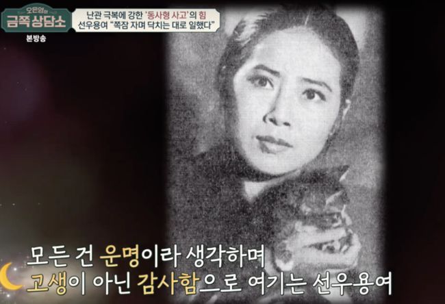 선우용여를 보며 오은영은 “난관을 진취적으로 해결해왔던 것이 보여, 동사형 사고를 하시는 분”이라며 “어려움이 닥쳐도 꿋꿋하고 극복해오신 것 현재 시세로 200억원이 넘는 빚을 어떻게 갚았는지 물었다. 선우용여는 빚을 갚기 위해 밤낮 없이 쉬지 않고 일했다며 눈가가 촉촉해졌다. 힘들었던 시절에 울컥한 그는 “고생이 아니다. 살아오면서 역경이 있어야 내 나이 돼서 감사할 줄 안다”며 웃음 지었다.