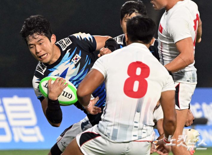 26일 오후 중국 항저우 사범대에서 열린 '2022 항저우 아시안게임' 7인제 럭비 결승전에서 한국 정연식이 홍콩 수비를 뚫고 있다. 항저우(중국)=황진환 기자 |