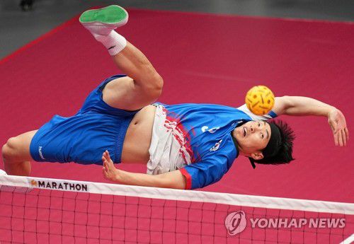 (진화[中 저장성] 신화=연합뉴스) 한국 세팍타크로 대표팀의 임안수가 26일 중국 저장성 진화 스포츠센터에서 열린 2022 항저우 아시안게임 남자 레구 단체전 조별리그 B조 2차전에서 말레이시아 선수들을 상대로 경기를 펼치고 있다. 이날 한국은 0-3으로 패해 1승 1패를 기록, 말레이시아(2승)에 이어 조 2위로 4강에 올랐다. 2023.09.26 besthope@yna.co.kr