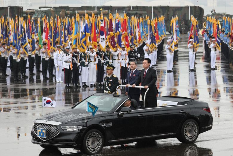 윤석열 대통령이 26일 성남 서울공항에서 열린 건군 제75주년 국군의날 기념식에서 사열하고 있다. 연합뉴스 |