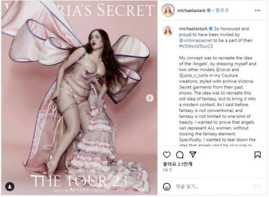 그는 또 자신의 인스타그램에 플러스 사이즈 모델이 빅토리아 시크릿의 상징인 천사 날개를 달고 있는 사진을 올리며 "천사가 모든 여성을 대표할 수 있다는 점을 증명하고 싶었다"고 적었다. 그러면서 "내 어릴 적 불안감과 신체 이형증의 근원을 무너뜨릴 기회를 가질 수 있어 감격스러웠다"고 덧붙였다.