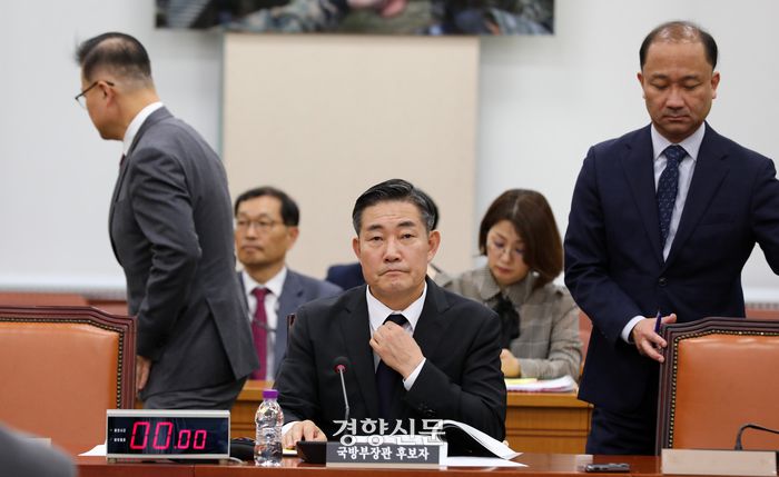 신원식 국방부장관 후보자가 27일 국회 국방위에서 인사청문회에서 무거운 표정으로 넥타이를 만지고 있다. 박민규 선임기자