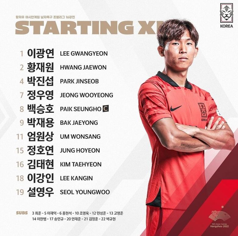 이밖에도 한국은 이광연, 황재원, 박진섭, 정우영, 백승호, 박재용, 엄원상, 정호연, 김태현, 설영우를 선발로 내세운다.