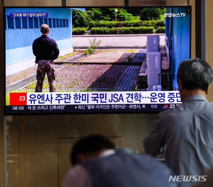 [서울=뉴시스] 정병혁 기자 = 7월18일 공동경비구역(JSA)을 견학하던 미군 1명이 월북했다. 로이드 오스틴 미국 국방장관은 18일(현지시간) "견학을 하던 우리 군인 중 한 명이 고의로 허가 없이 군사분계선을 넘었다"라고 밝혔다. 외신에 따르면 해당 인물은 2021년 입대한 미국 이등병 트래비스 킹으로 폭행 혐의로 텍사스 포트블리스로 귀환할 예정이었으며, 인천공항 보안검색대까지 호송됐으나, 비행기에 타지 않고 판문점으로 향하는 견학 그룹을 따라간 것으로 알려졌다. 19일 서울역 대합실에서 시민들이 공동경비구역을 통해 월북한 미군 관련 뉴스를 바라보고 있다. 2023.09.27. jhope@newsis.com