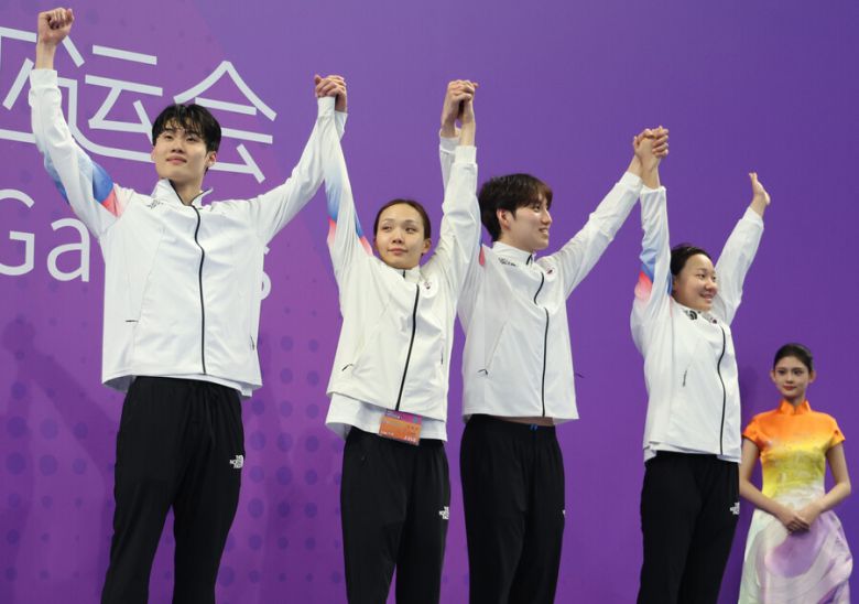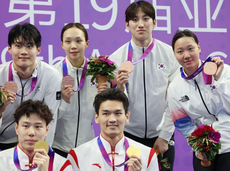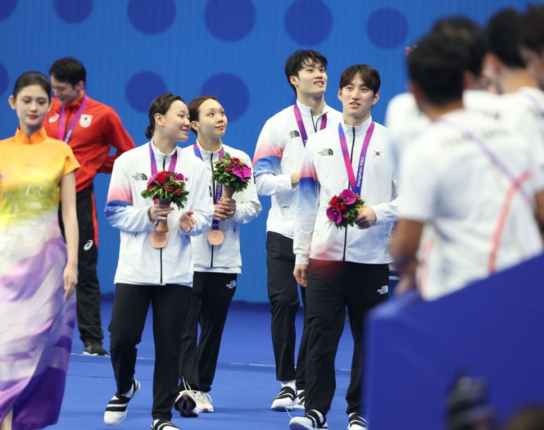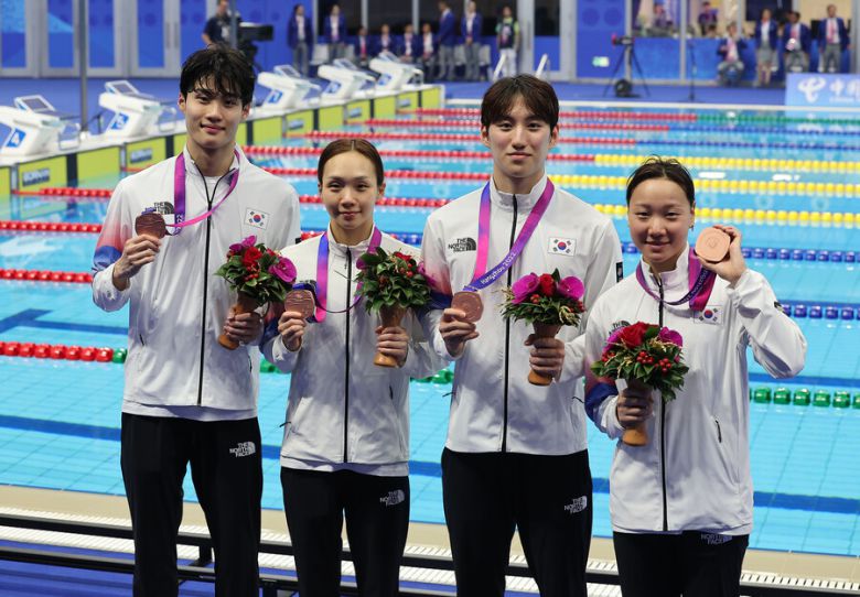 배영 이은지(17, 방산고)-평영 최동열(24, 강원도청)-접영 김서영(29, 경북도청)-자유형 황선우(20, 강원도청)로 구성된 한국은 27일 중국 저장성 항저우 올림픽 스포츠센터 수영장에서 열린 ‘2022 항저우 아시안게임’ 수영 경영 혼성 혼계영 400m 결선에서 3분46초78의 기록으로 동메달을 획득했다.