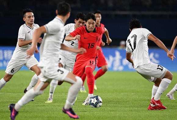 27일 중국 저장성 진화시 스포츠센터 스타디움에서 열린 2022 항저우 아시안게임 남자 축구 16강전 대한민국과 키르기스스탄의 경기에서 이강인이 돌파를 하고 있다.