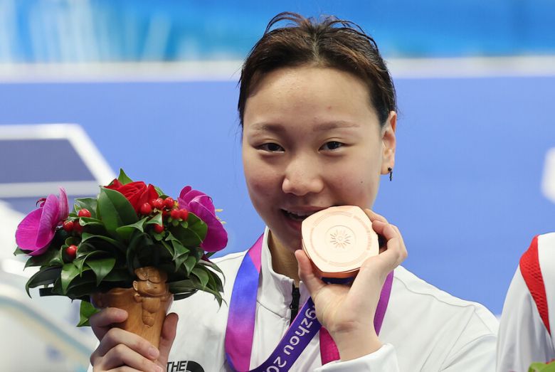 이은지는 27일 중국 저장성 항저우 올림픽 스포츠센터 수영장에서 열린 '2022 항저우 아시안게임' 여자 수영 배영 100m 결선에 출전했다. 이은지의 출발은 더뎠다. 반환점(50m)을 돈 시점에서 29초48로 4위를 기록했지만, 이후 폭발적인 스피드를 과시하며 순위를 끌어올렸다. 치고 올라오며 1분0초3의 기록으로 세 번째로 터치패드를 찍었다.