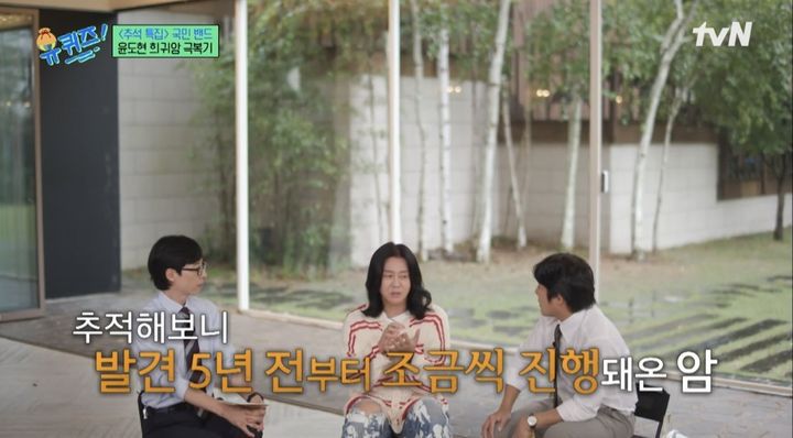 윤도현은 "이미 진행이 5년전부터 조금씩 진행되어온 암이더라. 발견이 굉장히 어려웠다. 추적해보니 이미 5년 전부터 발병이 됐던 암이고, 조금씩 진행이 되어왔다. 미처 발견을 못했던 것"이라고 설명했다.