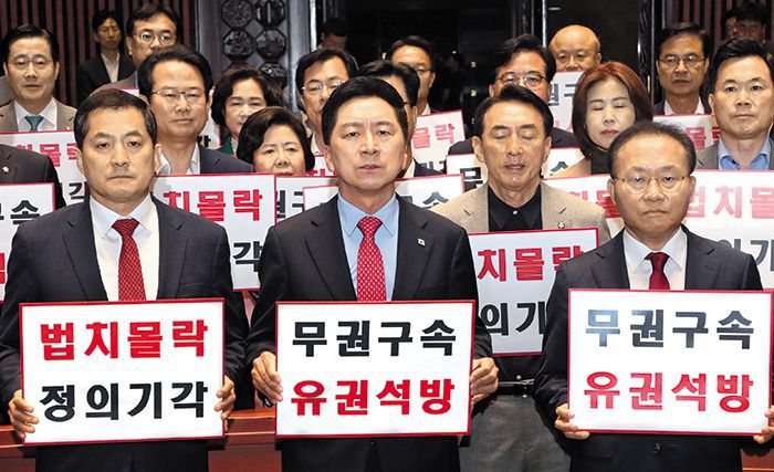 국민의힘 김기현(앞줄 가운데) 대표 등 지도부가 27일 오전 국회에서 ‘무권구속 유권석방’ 피켓을 들고 이재명 더불어민주당 대표 구속영장 기각에 대해 규탄하고 있다. /이덕훈 기자