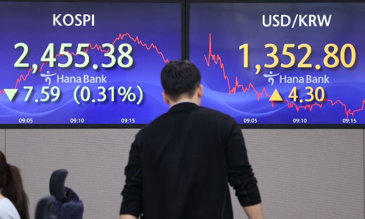 고금리 부담에 위험자산 투자심리는 극도로 위축되면서 코스피 지수는 2500선 아래로 밀렸다. 21일부터 4거래일 연속 하락한 지수는 27일 장중 한 때 2445.51까지 밀렸지만 후반 저가 매수세 유입으로 가까스로 0.09% 소폭 반등에 성공해 2465.07에 마감했다. 지난 4월6일(종가 2459.23) 이후 최저 수준이다. 최근 5거래일 동안 국내 주식시장에서 외국인은 7335억 원, 기관은 1조 3100억 원 어치를 순매도하며 지수 하락을 이끌었다. 미국 의회의 예산안 처리 지연에 따른 연방정부 업무정지(셧다운) 가능성, 전미 자동차노조(UAW)의 파업으로 인한 자동차 가격 상승 압력 등 다른 미국발(發) 불안 변수들이 동시다발적으로 부각된 점도 투심 악화에 일조했다.