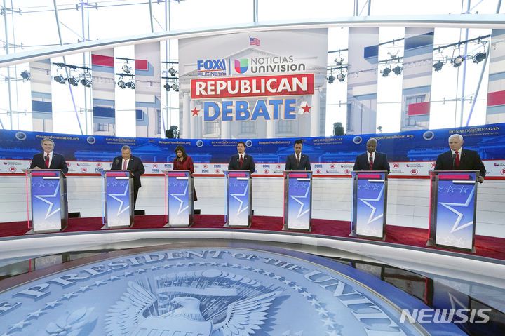 [시미밸리=AP/뉴시스]공화당 대선 후보(왼쪽부터)  더그 버검 노스다코타 주지사,크리스 크리스티 전 뉴저지 주지사, 니키 헤일리 전 유엔대사, 론 디샌티스 플로리다 주지사, 기업가 비벡 라마스와미, 팀 스콧 사우스캐롤라이나  상원의원, 마이크 펜스 전 부통령이  27일(현지시간) 캘리포니아주 시미밸리의 로널드 레이건 대통령 도서관에서 폭스비즈니스네트워크와 유니비전이 주최한 공화당 대선 예비 토론회에서 연단에 서 있다. 2023.09.28.