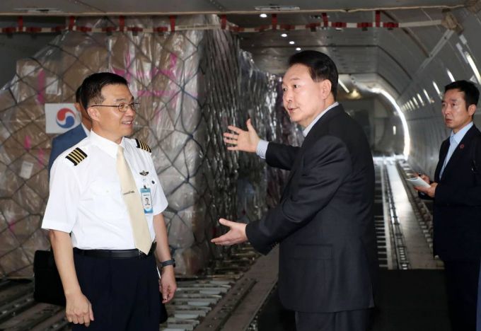 윤 대통령은 직접 화물기에 탑승해보기도 했다. 일본 도쿄행 화물기에 올라 기장으로부터 화물기 운항계획을 보고받고 "화물기 운항을 위해 힘쓰는 모든 분들이 우리나라 경제 성장을 뒷받침하고 있다는 점에 자부심을 가지고 맡은 바 임무를 수행해 주기를 바란다"고 당부했다. 화물기에서 내린 뒤에는 항공 화물 종사자들과 단체 기념촬영을 한 후 일일이 악수하면서 이들의 노고를 치하했다.
