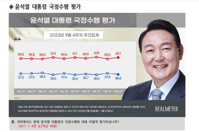 한편, 윤석열 대통령 지지율은 소폭 하락했다. 리얼미터 조사에 따르면, 윤 대통령의 국정 수행에 대한 긍정 평가는 전주(9월 3주차)보다 1.8%포인트(p) 하락한 36%로 집계됐다.