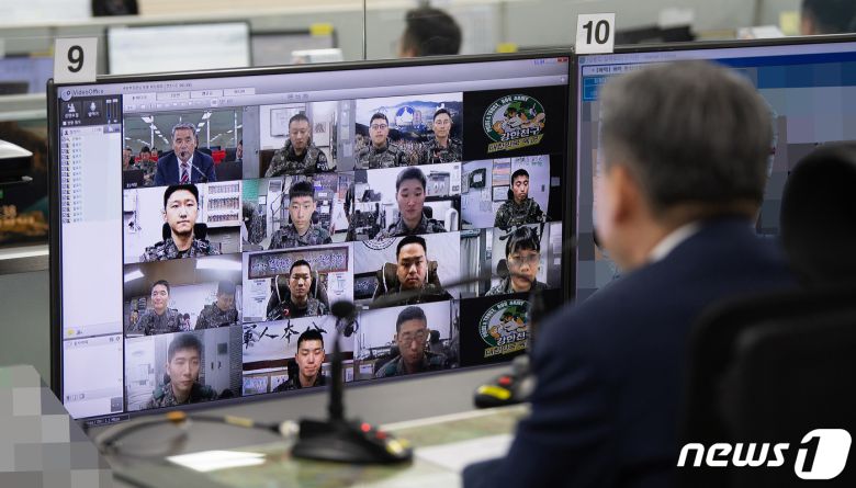 (서울=뉴스1) = 이종섭 국방부장관이 28일 육군 21사단 사령부를 찾아 GOP부대 주요직위자와 화상회의(VTC)를 하며 대비태세를 점검하고 있다. (국방부 제공) 2023.9.28/뉴스1
