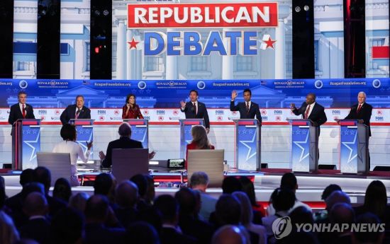 27일(현지시간) 더그 비검 노스다코타 주지사, 크리스 크리스티 전 뉴저지주지사, 니키 헤일리 전 유엔대사, 론 디샌티스 플로리다주지사, 사업가 비벡 라마스와미, 팀 스콧 전 상원의원, 마이크 펜스 전 부통령이 TV토론에 참가했다.