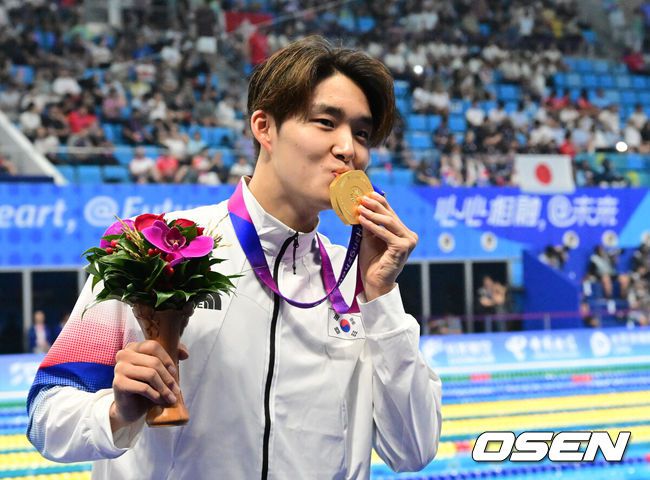 기존 쑨양이 가지고 있던 아시안게임에서 중국의 쑨양이 가지고 있던 7분48초36의 기록 깬 김우민이다. 그는 "일단 쑨양 선수의 대회 신기록을 갈아치워서 너무 좋다. 목표했던 기록 단축에 성공해서 정말 기분이 좋다"라며 웃었다.