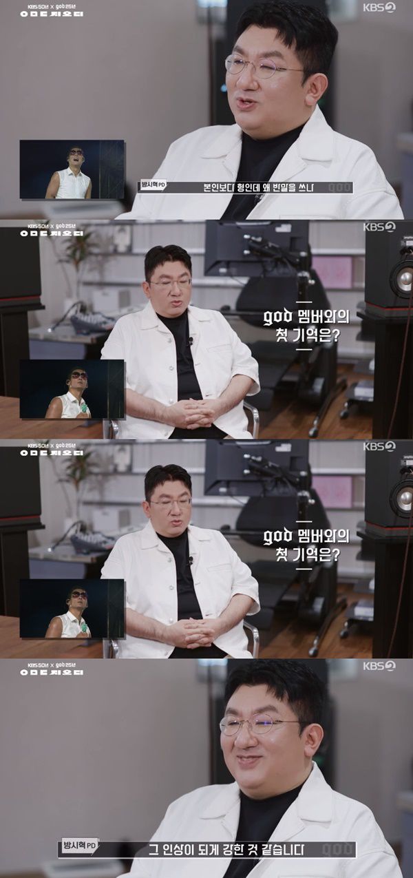god와의 재미있는 에피소드에 대해 방시혁은 "박준형 씨와 영어로 대화로 하는데 한국말로 나중에 대화를 하게 된 뒤에도 반말을 했다. 나중에 알았는데 멤버들이 저를 싫어했다고 하더라. 본인이 형인데 왜 반말을 하냐고 했다고"라고 설명해 웃음을 자아냈다.