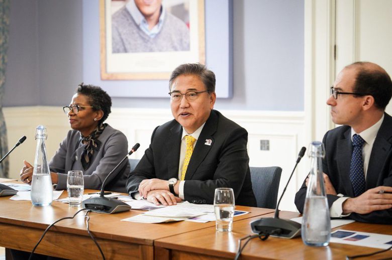 박진 외교부 장관이 지난 28일(현지시간) 킹스칼리지런던에서 한영 수교 140주년을 주제로 열린 라운드 테이블 토론회에서 발언하고 있다. 박 장관은 영국 일정을 마치고 29일 파리에서 현지 특파원들을 만나 조찬 간담회를 가졌다. /외교부 제공 |