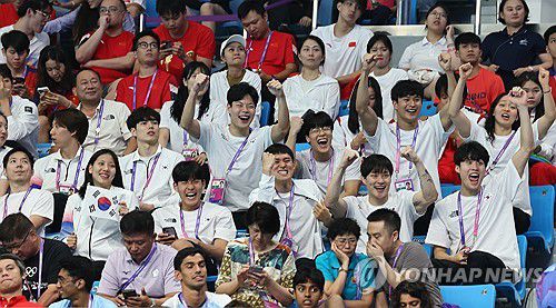 (항저우=연합뉴스) 김인철 기자 = 29일 중국 항저우 올림픽 스포츠센터 수영장에서 열린 19회 항저우 아시안게임 수영 남자 자유형 400m 결승에서 황선우를 비롯한 한국 수영 국가대표 선수 등이 김우민을 응원하고 있다. 2023.9.29