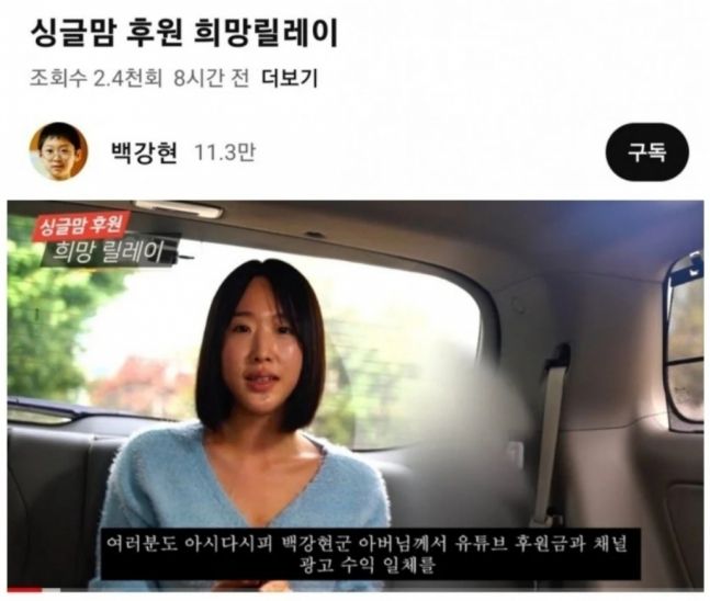 비난 댓글이 이어지자 백강현 측은 “싱글맘 관련 영상의 진행자 및 출연하신 싱글맘에게까지 비난의 댓글이 이어져 싱글맘 후원 관련 영상을 비공개 처리한다”고 전했다.
