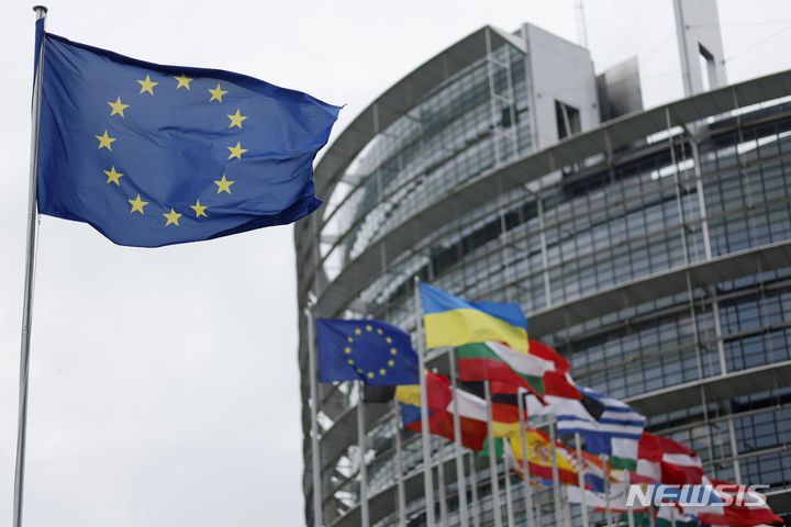 [스트라스부르(프랑스)=AP/뉴시스]유럽연합(EU) 비회원국인 노르웨이가 EU의 러시아 제재를 반영해 다음주부터 러시아 차량의 입국을 금지한다고 29일(현지시간) 발표했다. 사진은 프랑스 스트라스부르의 유럽의회 건물 앞에 유럽연합(EU) 깃발 등 유럽 국가 국기들이 펄럭이는 모습. 2023.09.30.