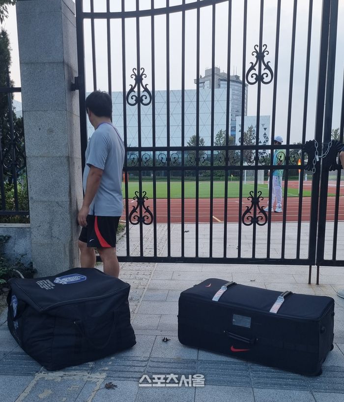 훈련장으로 들어가지 못하는 대표팀 짐. 항저우 | 박준범기자