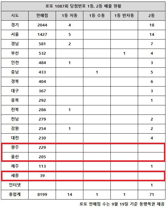 동행복권이 지난 9월 30일 추첨한 로또 1087회 당첨번호 조회 결과 1등은 16명, 2등은 71게임이다. 전국 17개 시도 중 광주, 울산, 세종 지역에서는 로또 고액(1,2등) 당첨 판매점이 단 한 곳도 나오지 않았다. |