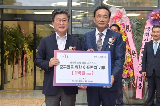 중구는 지역기업 솔라고개발(주)로부터 아트벤치를 기부채납받아 주민들이 많이 이용하는 공원 등에 설치할 예정이다. 지난달 25일에는 기증서 전달식도 가졌다. ‘솔라고 호텔 명동’ 개관기념으로 제작되는 아트벤치에는 작품명과 기업명이 새겨진 명판이 부착될 예정이다.