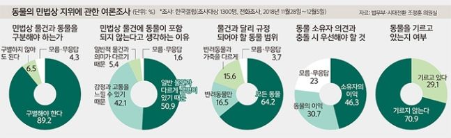 한편 국회 법사위원들은 지난 7월 세계일보가 진행한 설문조사에서 동물의 비물건화 민법 개정안에 대해 법사위원 18명(민주당 10명, 국민의힘 7명, 시대전환 1명) 중 8명만이 찬성한다고 밝혔다.