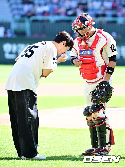 배우 이정하가 시구를 마치고 SSG 김민식과 인사를 나누고 있다. 2023.10.01 /jpnews@osen.co.kr