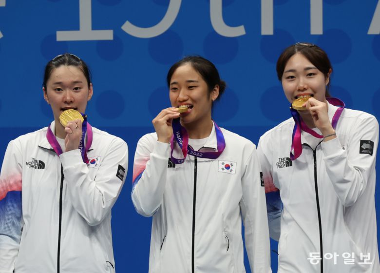 1일 중국 항저우 빈장체육관에서 열린 2022 항저우 아시안게임 배드민턴 여자 단체전에서 한국이 중국을 꺾고 금메달을 차지했다. 시상식에서 선수들이 금메달을 깨물어보고 있다. 김재명 기자 base@donga.com |