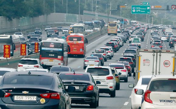추석 연휴 첫날인 28일 서울 양재IC 인근 경부고속도로 상하행선이 정체를 빚고 있다. [사진=뉴시스] |