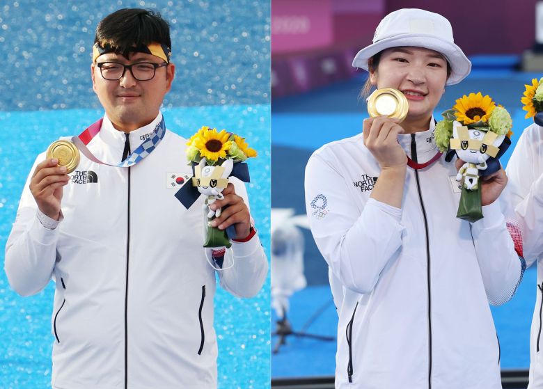 도쿄 올림픽 당시 남녀 양궁 단체전에서 금메달을 획득했던 김우진(왼쪽)과 강채영. 그러나 이번 항저우 아시안게임에서는 예선라운드에서 탈락해 뛸 수 없게 됐다. /이태경 기자, 연합뉴스 |