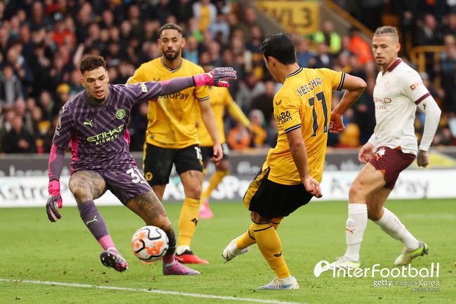 이날 울버햄튼은 철저하게 선수비 후역습 전술을 들고 나왔다. 최전방에 황희찬, 마테우스 쿠냐, 페드로 네투를 배치하며 빠른 스피드로 맨시티의 뒷공간을 노리겠다는 집념으로 경기에 나섰다.