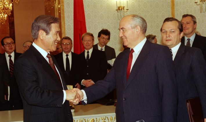 노태우 전 대통령이 1990년 12월 14일 옛 소련 크렘린궁에서 미하일 고르바초프 대통령과 정상회담에 앞서 악수하는 모습. 연합뉴스