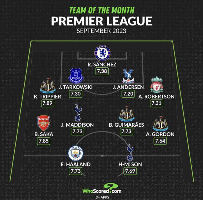 축구통계매체 '후스코어드닷컴'은 1일(한국시간) 공식 SNS 채널을 통해 2023-24시즌 9월 프리미어리그(PL) 평점 베스트 일레븐을 공개해 발표했다. 포메이션은 4-4-2다.