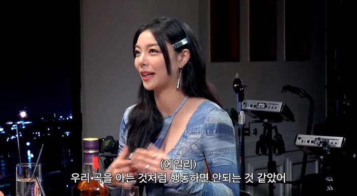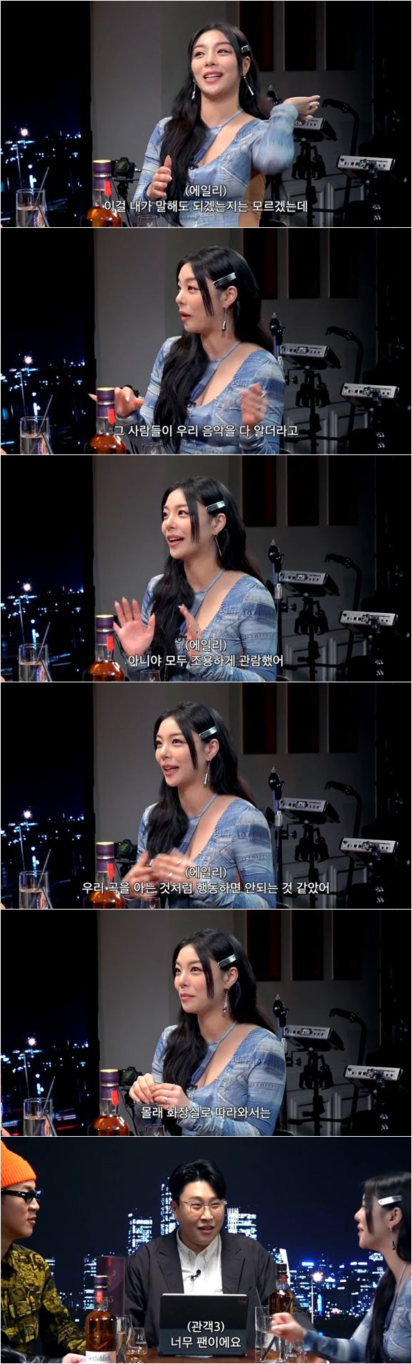 에일리는 "이걸 내가 말해도 되는지도 모르겠는데"라며 운을 떼고는 "그 사람들이 우리 음악을 모두 알더라"라고 조심스레 밝혔다.