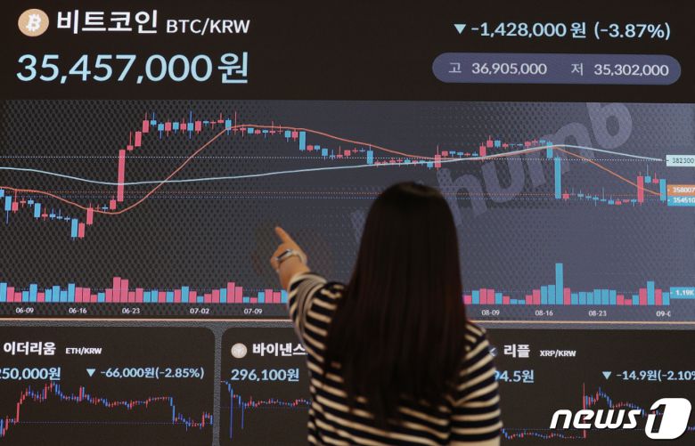 1일 서울 강남구 빗썸고객지원센터 전광판에 비트코인 시세가 나오고 있다. 2023.9.1/뉴스1 ⓒ News1 김민지 기자 |