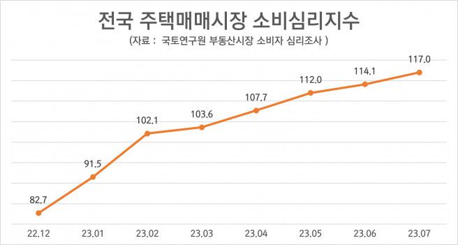 2일 국토연구원 부동산시장 소비자 심리조사 자료에 따르면 전국 주택매매시장 소비심리지수는 지난해 12월 82.7을 기록한데 이어 △올해 1월 91.5 △2월102.1 △3월 103.6 △4월 107.7 △5월 112.0 △6월 114.1 △7월 117.0으로 지속적인 상승세를 그리고 있는 것으로 나타났다. 소비심리지수는0~200사이의 값으로 표현되며, 지수가100을 넘으면 가격 상승이나 거래 증가 응답이 많음을 의미한다.