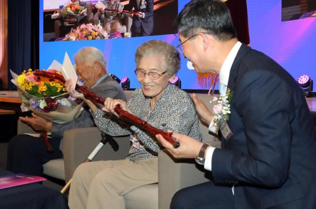 지난달 25일 서울 중구 대한상공회의소 국제회의장에서 열린 제27회 노인의 날 기념식에서 보건복지부 이기일 제1차관(오른쪽)이 100세 어르신 대표로 김택수 어르신(왼쪽)과 김영실 어르신에게 '청려장'을 증정하고 있다. [사진=연합뉴스] |