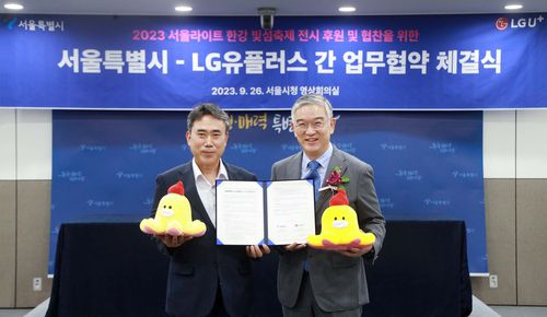 ▲ LG유플러스[032640]는 자사 캐릭터 '무너'를 활용해 '2023 서울라이트 한강 빛섬축제'(이하 빛섬축제)에 참여하기로 하고 서울시와 이 축제 후원 및 협찬을 위한 업무협약(MOU)을 체결했다고 2일 밝혔다. 오는 6∼15일 서래섬과 반포한강공원 일대에서 열리는 빛섬축제는 서울시 최초의 레이저아트 무대로, LG유플러스는 서래섬 일대에 무너 캐릭터를 모티브로 한 미디어아트 작품과 조형물, 포토존 등을 설치한다. (서울=연합뉴스)