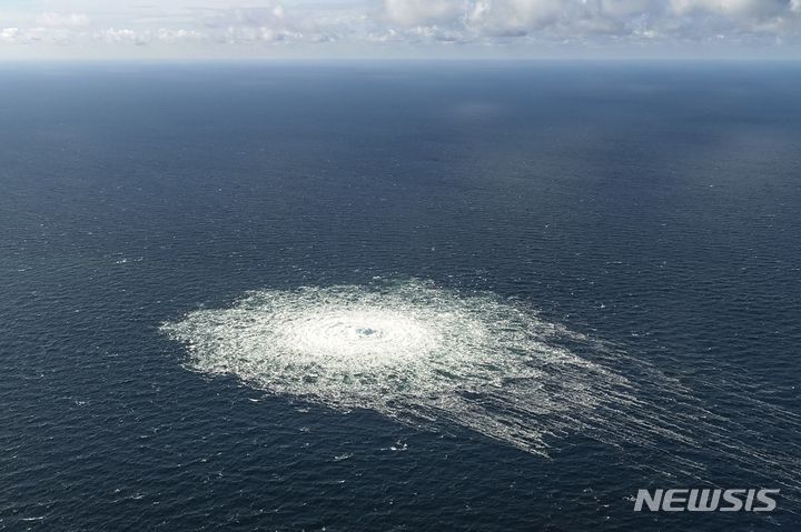 [보른홀름(덴마크)=AP/뉴시스] 사진은 지난해 9월 러시아에서 독일로 이어지는 두 개의 천연가스관 노르트스트림 천연가스관이 잇따라 가스 유출사고가 발생한 후 덴마크 보른홀름섬 해안에서 관찰된 가스 누출 모습. 2023.05.24 *재판매 및 DB 금지 |