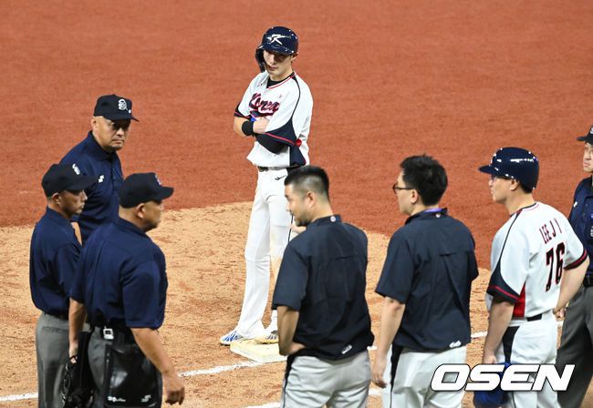 그러나 심판진은 2루 주자 최지훈에게 1루로 돌아오라며 뜻밖의 판정을 내렸다. 한국 코치진과 홍콩 코치진 모두 이해할 수 없는 심판진의 ‘역진루’ 결정에 항의했지만 결국 2루 주자 최지훈은 아웃됐고, 노시환을 1루로 다시 부르며 경기는 재개됐다.