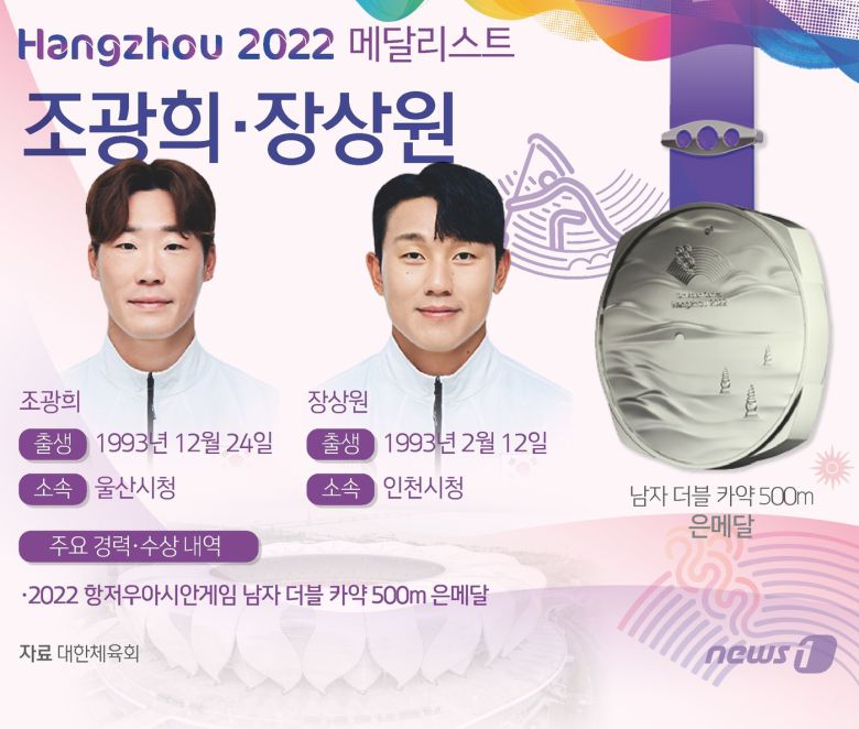 (서울=뉴스1) 김초희 디자이너 = 조광희(울산시청)와 장상원(인천시청)이 2022 항저우 아시안게임 카누 종목에서 첫 메달을 수확했다. 조광희-장상원은 2일(한국시간) 중국 항저우 푸양 수상스포츠센터에서 열린 대회 카누 남자 스프린트 카약 2인승 결선에서 1분37초690의 기록으로 중국의 부팅카이-왕콩캉(1분36초658)에 1.032초 뒤진 2위로 결승선을 통과, 은메달을 목에 걸었다.