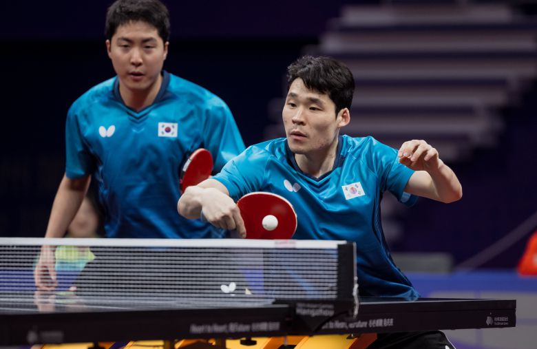 남자 탁구 장우진(오른쪽)고 임종훈이 지난 1일 열린 아시안게임 남자 복식 결승에서 중국을 상대하고 있다. /EPA 연합뉴스 |